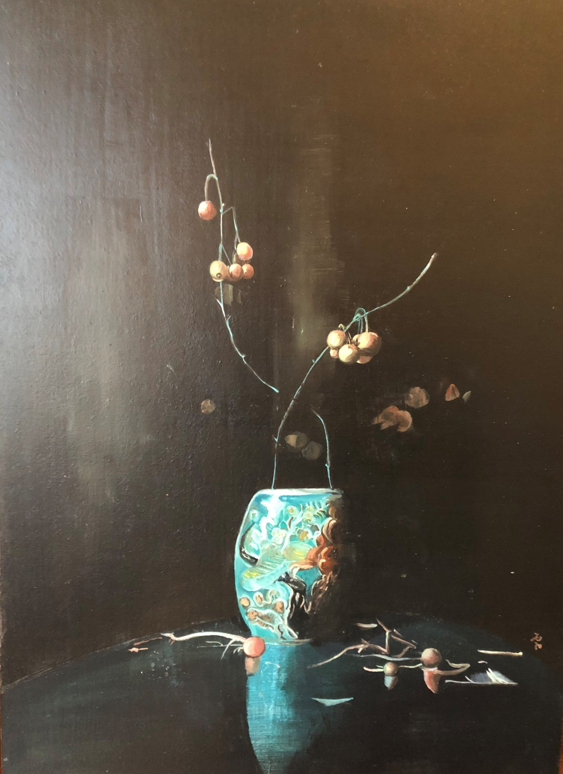 Colores cálidos que se funden con las transparencias del cristal y del agua, y las sombras que acompañan el realismo de una escena cotidiana.